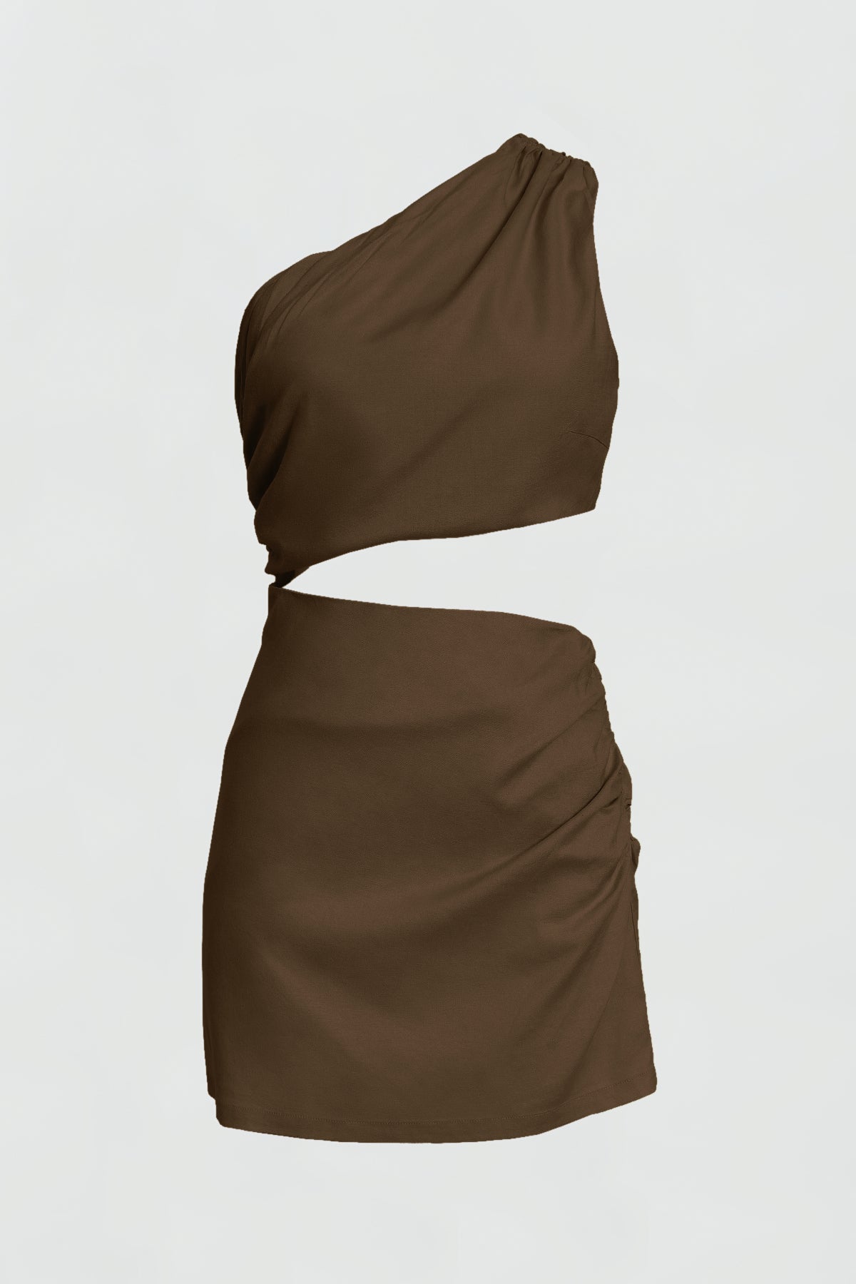 This modern mini combines statement style with ease. Featuring a waist cutout, soft front ruching, and asymmetric construction, the Logan zips up for a secure, flattering fit—ideal for warm days and bold nights.