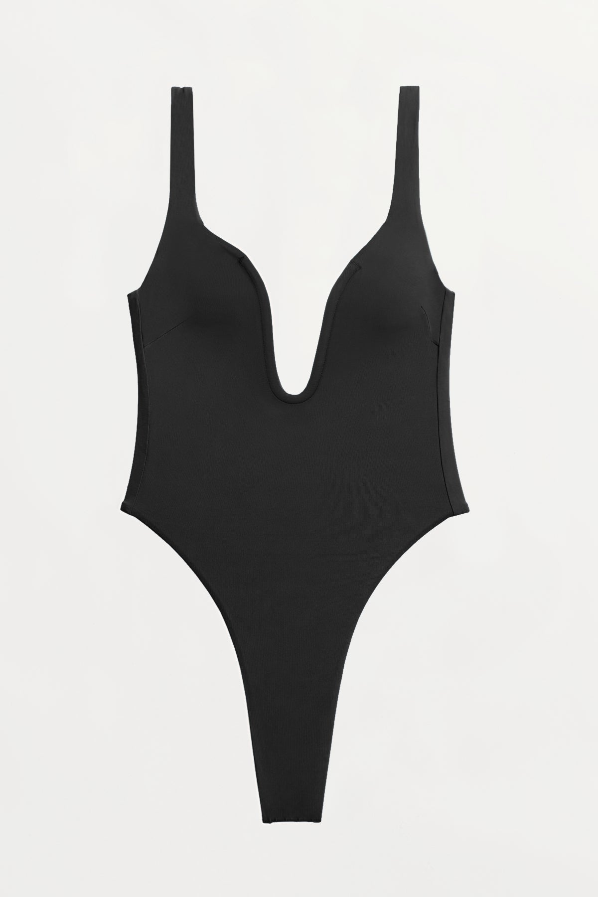 Confident swim stylists only. This one-piece swimsuit is designed with a high-cut thong bottom, deep plunging neckline, and a dramatic open back for a dramatic but necessary swimwear look.