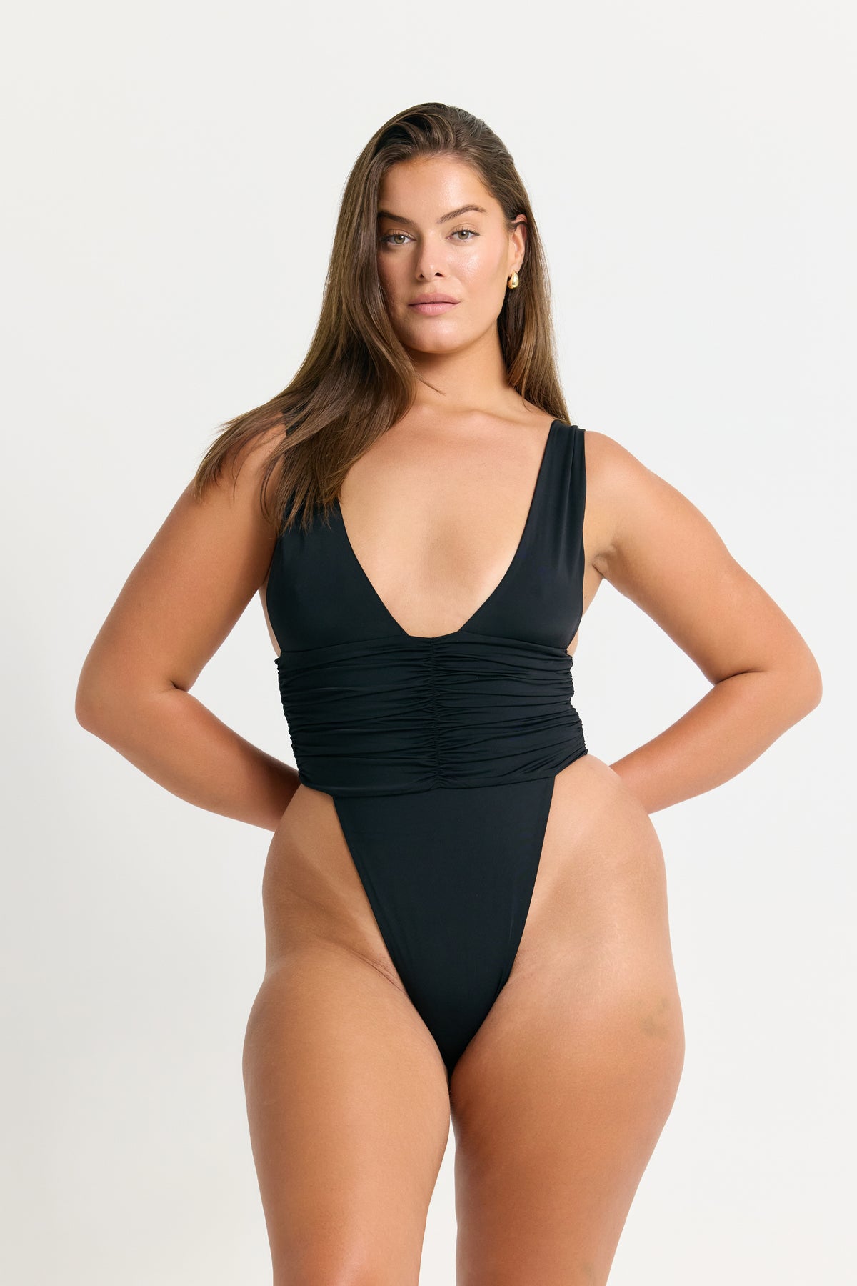 Our best-selling one-piece swimsuit! Equal parts sophisticated and sexy, the Echo One-Piece hugs your body and highlights your hips with a high-legged cut and minimal back coverage. The ruched side detail is met by moderate bust coverage and supportive shoulder straps. Super soft and super stretchy, this one-piece doubles as a bodysuit for an effortless beach-to-bar look. Just like an echo, you will want to repeat this purchase in every shade.