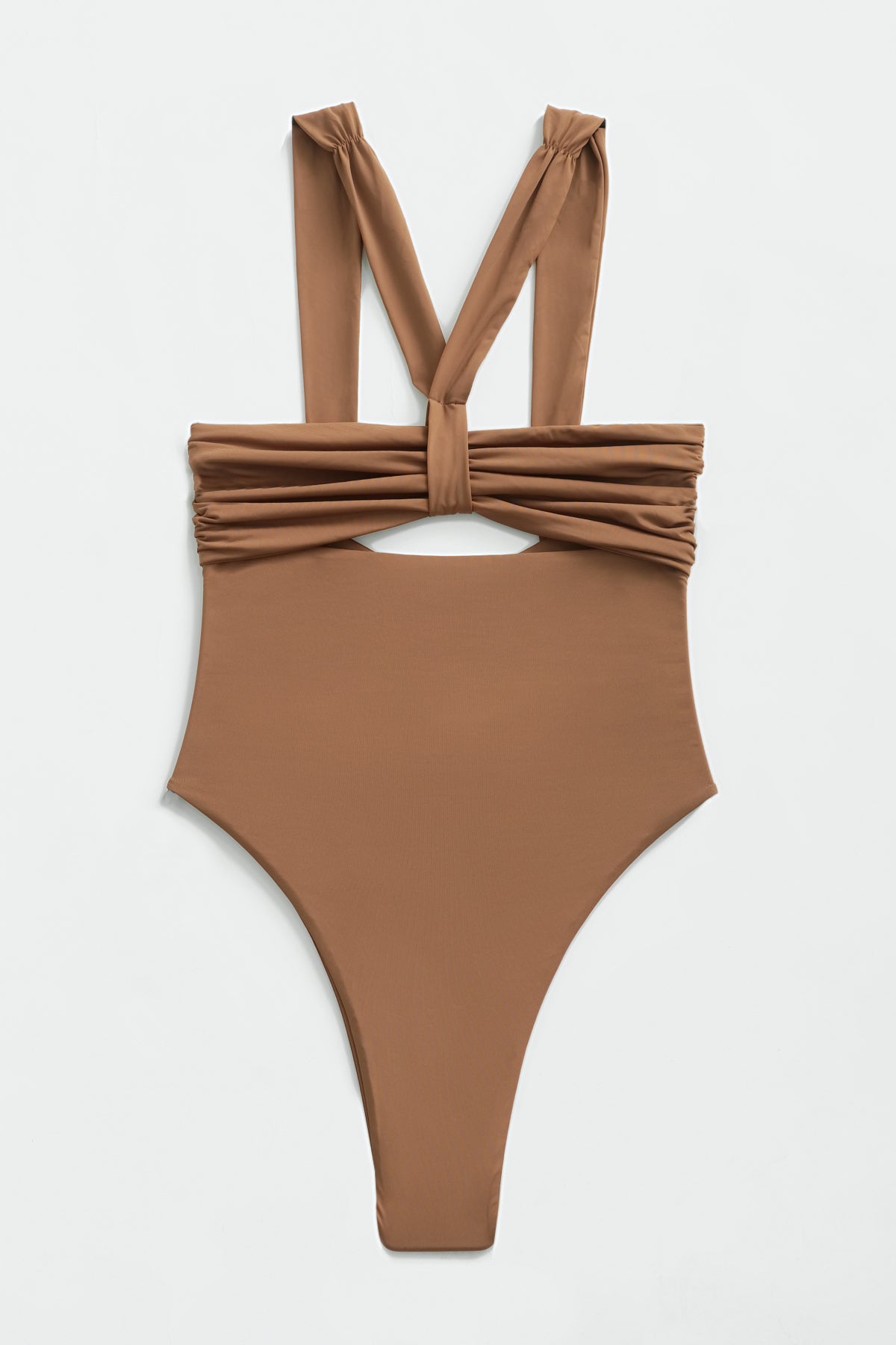 Halter Top One Piece Swimsuit with Cutout Midriff Section in a Brown Sugar Color